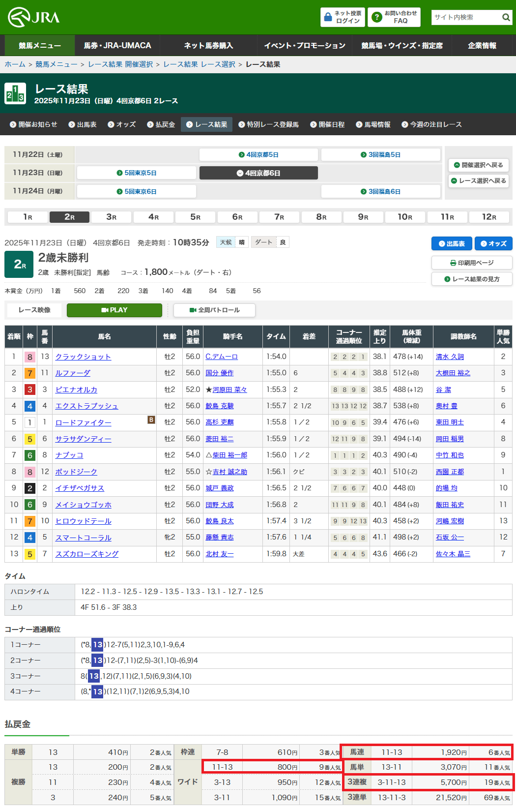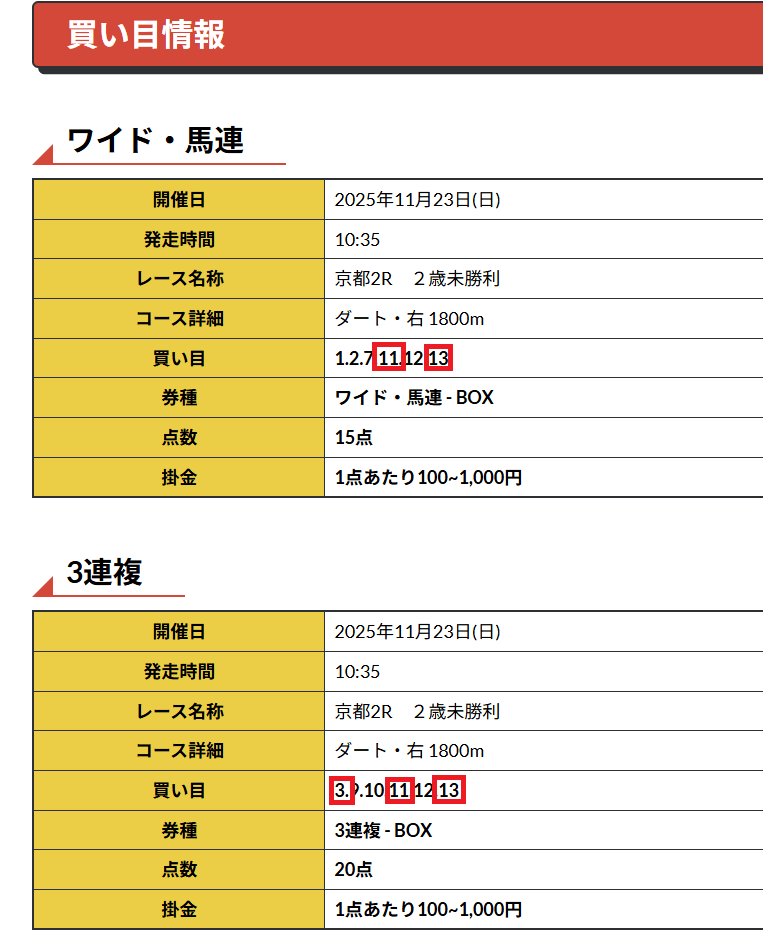 23日、公開された京都2R無料予想でワイド・馬連・3連複、公開された買い目が全的中!
