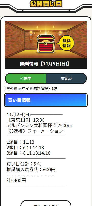 僕も重賞無料予想的中しました、今回点数少なかったので1点千円で馬券買ってたから3連複万馬券(115.6倍)で 11万5600円払い戻しでした! 無料予想、更に重賞予想で10万台的中は嬉しいものですね!